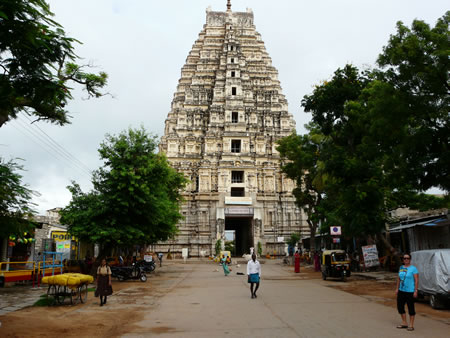 | Sanctuaire construit au XVIe, Virupaksha se compose d'une tour pyramidale "gopuram". Toujours en activité, les fervents viennent y déposer des offrandes. | ![]() |