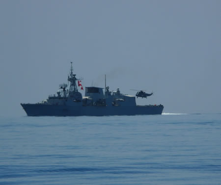 Un bateau de guerre canadien de l'Otan qui patrouille dans le golfe d'Aden nous accompagne un bout de chemin avec son hélicoptère de surveillance. |